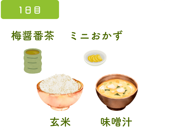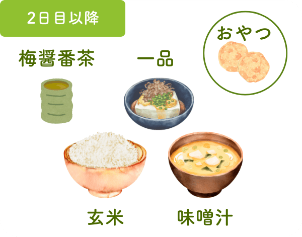 1日目だけは、一品おかずとおやつ無しの「シンプルな玄米食」をお召し上がりいただきます。